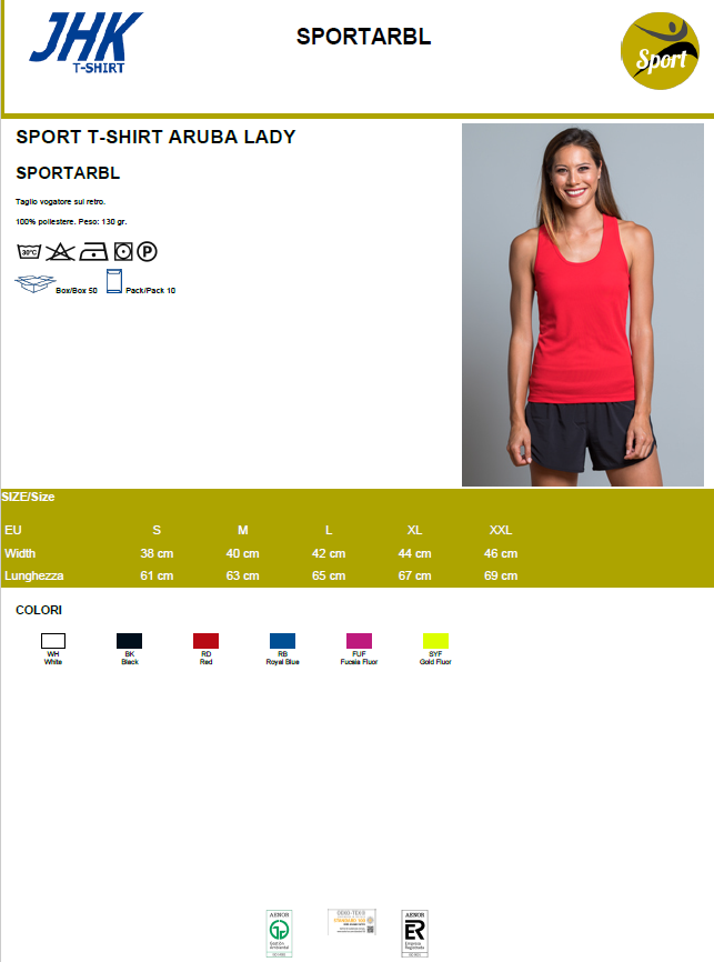 Home / Abbigliamento / Sport / T-shirt / JHK Canotta Sport Donna SPORTARBL JHK Canotta Sport Donna SPORTARBL Canotta Donna Tessuto Tecnico Descrizione Informazioni aggiuntive Descrizione Taglio vogatore sul retro. 100% poliestere. Peso: 130 gr. Informazioni aggiuntive Marca JHK Prodotti correlati Abbigliamento , Donna FRUIT T-shirt valueweight Lady Collo V 613980 T-shirt Donna Collo V 100% Cotone Abbigliamento , T-shirt FRUIT T-shirt valueweight Fitted 612000 T-shirt Girocollo Taglio adesrente SLIM FIT 100% Cotone Abbigliamento , Canotte JHK Canotta Lady Ibiza TSULIBZ Canotta Donna Corta Abbigliamento , T-shirt JHK T-shirt Urban TSUA150 T-shirt taglio attillato SLIM FIT 100% cotone