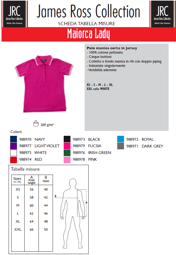 Home / Abbigliamento / Polo / Donna / JRC MAIORCA LADY Polo Jersey JRC MAIORCA LADY Polo Jersey Polo Lady Jersey 100% Cotone 200g Descrizione Informazioni aggiuntive Descrizione Informazioni aggiuntive Marca JRC Prodotti correlati Abbigliamento , Donna JHK T-shirt Trinidad TSULTRND T-shirt Donna Scollo ampio 100% Cotone Abbigliamento , Canotte JHK Canotta Paradise TSULPRDS Canotta Donna Taglio Vogatore 100% Cotone Abbigliamento , T-shirt JHK T-shirt Regular TSRA150 T-shirt girocollo 100%cotone Abbigliamento , T-shirt FRUIT T-shirt Valueweight collo V 610660 T-shirt collo V 100% Cotone