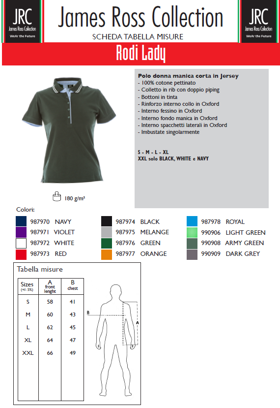 Home / Abbigliamento / Polo / Donna / JRC RODI LADY polo Jersey JRC RODI LADY polo Jersey Polo Lady Jersey 100% Cotone 180g Con Riga in contrasto su Manica e Colletto Descrizione Informazioni aggiuntive Descrizione Informazioni aggiuntive Marca JRC Prodotti correlati Abbigliamento , Donna JHK T-shirt Papua TSULPAPLS T-shirt Manica Lunga 50%Viscosa 50%Cotone Abbigliamento , T-shirt FRUIT T-shirt Baseball 610260 T-shirt Bicolore 100% Cotone Abbigliamento , Canotte JHK Canotta Paradise TSULPRDS Canotta Donna Taglio Vogatore 100% Cotone Abbigliamento , T-shirt FRUIT T-shirt Softspun 614120 T-shirt girocollo tessuto softspun 100% cotone
