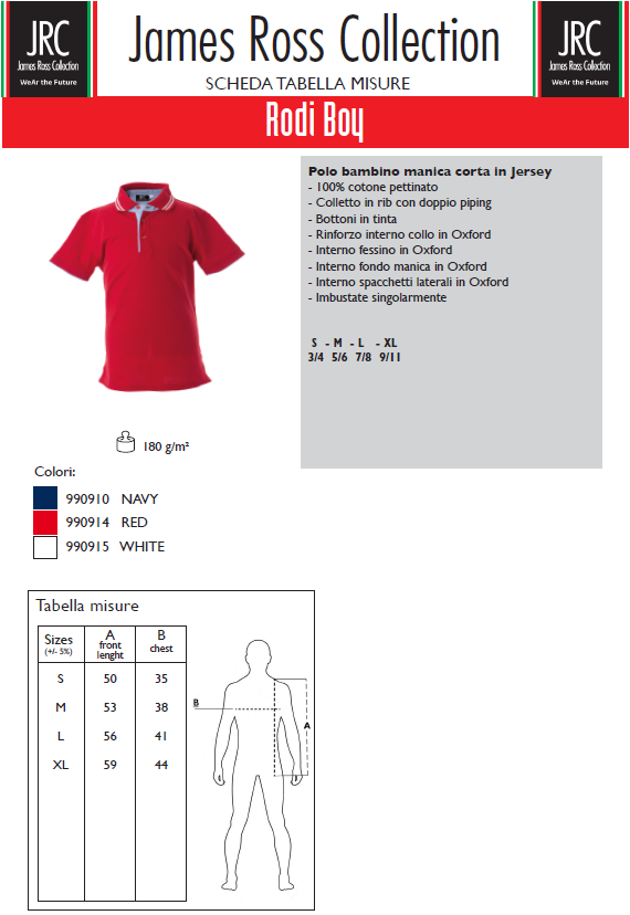 Home / Abbigliamento / Polo / Bambino / JRC RODY BOY Polo Piquè JRC RODY BOY Polo Piquè Polo Bambino Jersey 100% Cotone 180g Righe in contrasto su Polsini e Colletto Descrizione Informazioni aggiuntive Descrizione Informazioni aggiuntive Marca JRC Prodotti correlati Abbigliamento , Canotte JHK Canotta Paradise TSULPRDS Canotta Donna Taglio Vogatore 100% Cotone Abbigliamento , Donna FRUIT T-shirt valueweight Lady Collo V 613980 T-shirt Donna Collo V 100% Cotone Abbigliamento , T-shirt FRUIT T-shirt Valueweight collo V 610660 T-shirt collo V 100% Cotone Abbigliamento , T-shirt FRUIT T-shirt valueweight Fitted 612000 T-shirt Girocollo Taglio adesrente SLIM FIT 100% Cotone